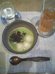 おおきなテーブルで抹茶のぜんざいをいただく